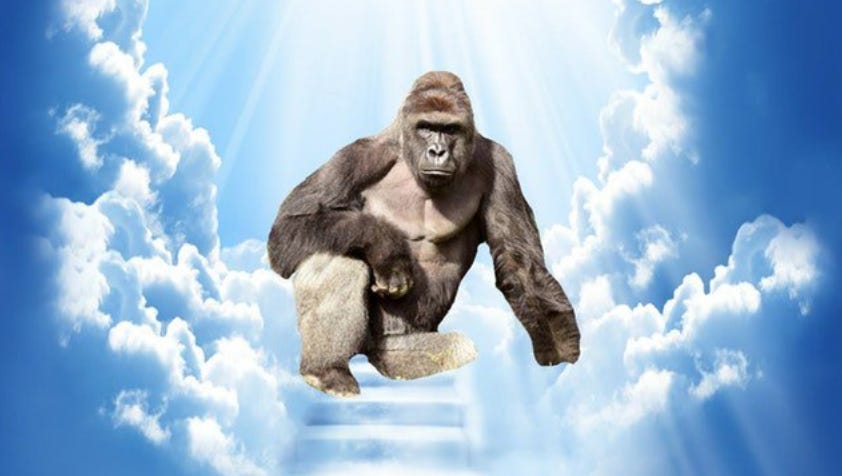 At 3 a.m., bathed in the blue light of your screen— absolutely zooted on sleep deprivation and the last dregs of your fourth cold brew— you mindlessly scroll past a meme. It’s not even a new meme; it’s the thousandth iteration of the same meme: the Harambe Heaven Meme.