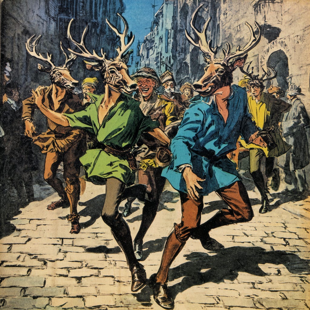 Picture this: It’s January 1st in Arles, early 6th century. The streets are complete chaos. Men stumble through cobblestones wearing women’s dresses and flower crowns. Others have donned stag heads and goatskins, bleating mock-prayers to Janus. Wine flows from jugs held by baptized Christians who were literally in church last Sunday. Dice clatter. Fortune-tellers whisper predictions. The whole city has shut down for the Kalends of January, the way it’s shut down for this week since before anyone can remember.